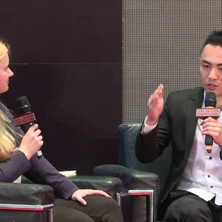Aaron Lee, founder of Dash Serviced Suites, is interviewed on stage at Silicon Dragon Hong Kong 2016, April 14, by Jennifer Thompson of the Financial Times.